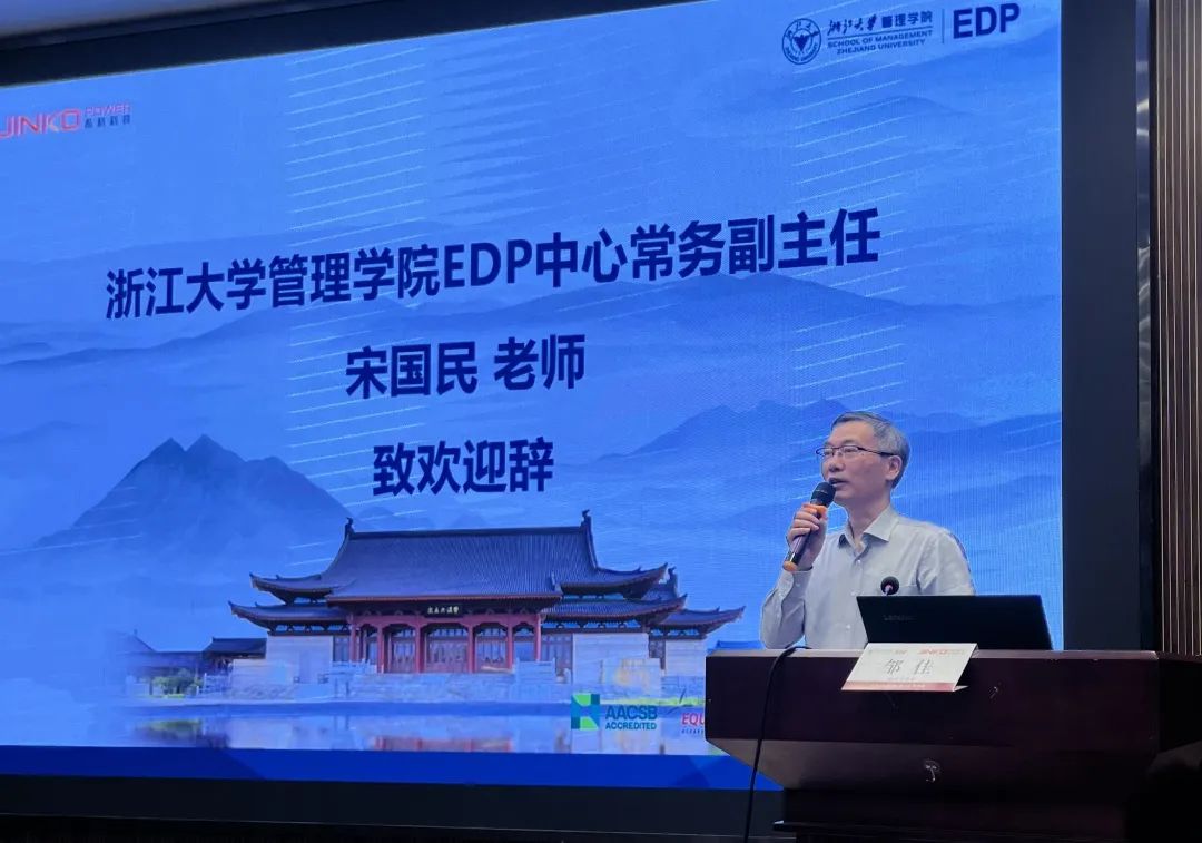 在开班仪式上,各位学员和领导在庄严的校歌声中进行了校徽佩戴仪式。浙江大学管理学院 EDP 中心原常务副主任宋国民首先致辞,他对晶科科技的领导与学员们表示热烈欢迎,并向学员介绍了浙江大学和管理学院的历史沿革,期望各位学员能在百年浙大开阔视野,汲取知识精华,使丰富的实践经验得以总结和升华。最后宋主任预祝本期浙江大学-晶科科技晶英训练营管理能力提升研修班取得圆满成功!